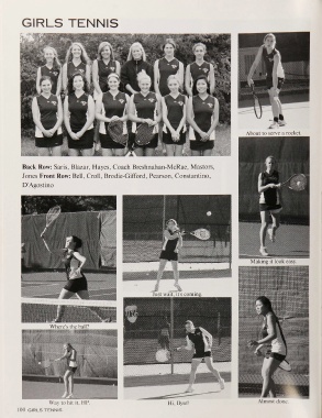 GIRLS TENNIS About to serve a rocket. Back Row: Saris, Blazar, Hayes, Coach Breshnahan-McRae, Mastors, Jones Front Row: Bell, Croll, Brodie-Gifford, Pearson, Constantino, D'Agostino Way to hit it, HP. Hi, Ilyse! Almost done. 100 GIRLS TENNIS