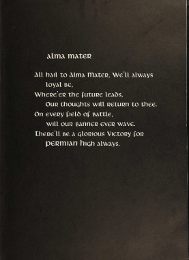 Alrm im teR ALL haiL to ALma mateR, We ll aLways Loyal Be, Wheue’eR the futuRe Leads, Our thoughts will RetuRn to thee On eveRy field of Battle, will our BanneR eveR wave. theRe’LL Be a qLorious VictoRy foR peRmiAn high always.