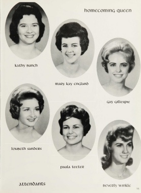 homecoming queen kA thy Bunch mARy k^y enqUnP qay qiLLespie LouBeth sanPeRS PauU teeteR Attendants BevcRly winkle 73