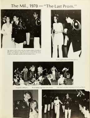 The M il., 1970 — "The Last Prom." “ My girdle is killing m e." The Sir Ralieghs egg Cadets into a frenzie. Cathy Mitch and Mike Niedermaier in the Grand March.