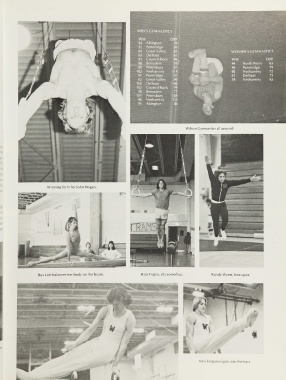 11^ Bev Lott balances her body on the beam. Ron Triglia, all crossed up. Randy Wynn, free spirit. Alex Ferguson gets into the bars