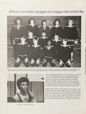 Wilson Wrestlers. F I R S T R O W , K N E E L I N G , L E E T T O R IC F T T : Joel Viechnicki, Dave Swangler, Geary Jefferson, Paul Rooney; S E C O N D R O W : Bruce