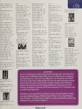 76,77, 82, 129 Wagelie, Sarah 10,13, West, Justin 111 Woodson, Taylor 70, 105 Zeleny, Kim 96