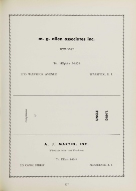 m. g. alien associates inc. BUILDERS Tel. HOpkins 3-8559 1153 W A RW ICK AVENUE W ARW ICK, R. I. « © U Z Z < 8 © 3 O O A . J . M A R T I N , I N C . Wholesale Meats and Provisions Tel. DExter 1-4045 225 CANAL STREET PROVIDENCE, R. I.