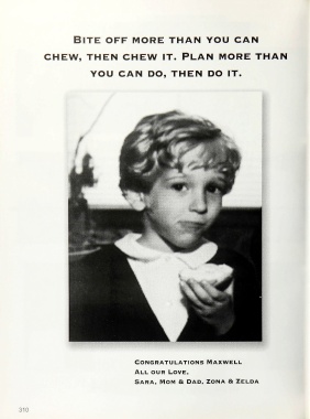 B i t e o f f m o r e t h a n y o u c a n C H E W , T H E N C H E W IT. P L A N M O R E T H A N YOU C A N DO, T H E N DO IT. C o n g r a t u l a t i o n s m a x w e l l A ll o u r L o v e, S a r a , Mom & Da d , Zo n a & Z e l d a 310