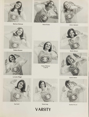 Barbara Herman Chris Coleman Debbie Shearer Karen Jensen Tanya Mentzer Captain Lorraine Mager Sandy James .w } \ / f . Sue Lord Nina Long VARSITY