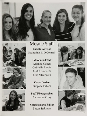 Mosaic Staff Faculty Advisor Katharine E. O'Connell Editors-in-Chief Arianna Cohen Gabriella Llopiz Leah Lombardi Julia Silverstein Cover Design Gregory Lullam Staff Photographer Alexandra Gray Spring Sports Editor Susan Stallman