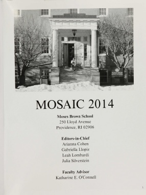 MOSAIC 2014 Moses Brown School 250 Lloyd Avenue Providence, RI 02906 Editors-in-Chief Arianna Cohen Gabriella Llopiz Leah Lombardi Julia Silverstein Faculty Advisor Katharine E. O'Connell
