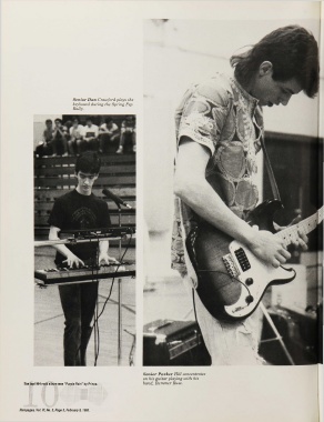 Senior Parker Hill concentrates on his guitar playing with his Ibetop1984 rock album was “Purple Rain" by Prince. band, Rummer Ruse. Rampages, VoL VI, No. 5, Page 5, February 8, 1985.