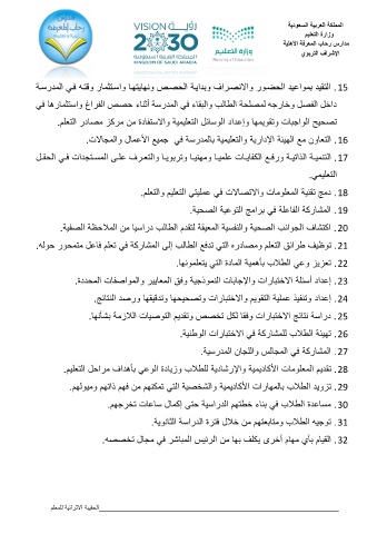 . 15التقيد بمواعيد الحضوور والانصوراف وبدايوة الحصوص ونهايتهوا واسوتثمار وقتوه فوي المدرسوة