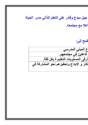 د جيل مبدع وقادر على التعلم الذاتي مدى الحياة اعلا مع مجتمعه. طمح إلى: وع المبني المدرسي و فاعلين في مجتمعهم. أرقى المستويات التعليم ة بكل ثقة. تكار و الإبداع وتحفيزهم نحو الم اركة في