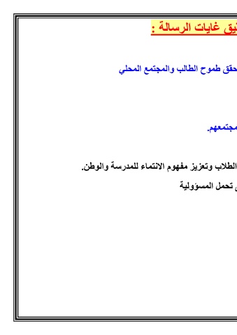 قيد غايات الرسالة : حقد طموح الطالب والمجتمع المحلي مجتمعهم. الطلاب وتعزيز مفهوم الانتماء للمدرسة والوطن. ى تحمل المسؤولية