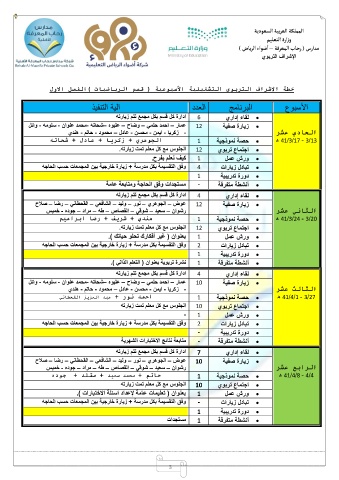 وفق التقسيمة بكل مدرسة +زيارة خارجية بين المجمعات حسب الحاجه أنشطة متفرقة الرابع عشر