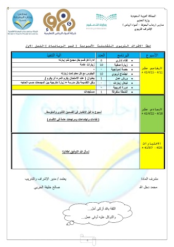 وفق التقسيمة بكل مدرسة +زيارة خارجية بين المجمعات حسب الحاجه - دورة تدريبية