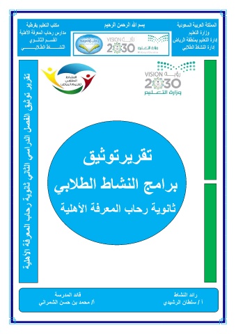 تقرير توثيق الفصل الدراسي الثاني ثانوية رحاب المعرفة الأهلية تقريرتوثيق برامج النشاط الطلابي ثانوية رحاب المعرفة الأهلية قائد المدرسة رائد النشاط أ /محمد بن حسن الشمراني أ /سلطان الرشيدي