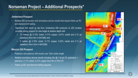 • Multiple anomalous aircore results including: 8m @ 1.44 g/t 2E (palladium +