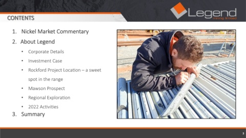 CONTENTS 1. Nickel Market Commentary 2. About Legend • Corporate Details • Investment Case • Rockford Project LocaOon – a sweet spot in the range • Mawson Prospect • Regional ExploraOon • 2022 AcOviOes 3. Summary 3