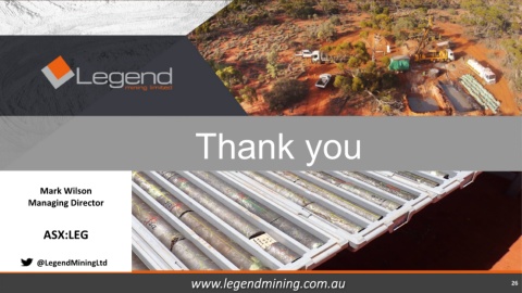 Thank you Mark Wilson Managing Director ASX:LEG @LegendMiningLtd www.legendmining.com.au 26