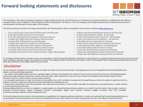 • 13 September 2021 Drilling of New Targets at Mt Alexander • 23 June 2022 Exploration Update for St George Mining