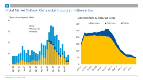 Nickel Market Outlook: China nickel imports at multi-year low Data: LME, CRU, S&P Global 20