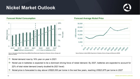 Nickel price is forecasted to stay above US$20,000 per tonne in the next few years, reaching US$23,875 per tonne in 2027