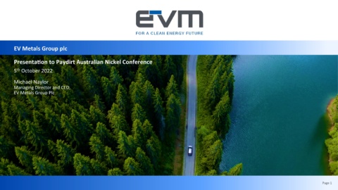 EV Metals Group plc Presenta(on to Paydirt Australian Nickel Conference th 5 October 2022 Michael Naylor Managing Director and CEO, EV Metals Group Plc Page 1