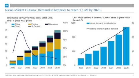 Nickel Market Outlook: Demand in batteries to reach 1.1 Mt by 2026 Data: CRU Note: high nickel chemistries include NMC721, NMC811 & NMCA, medium nickel chemistries include NMC532 & NMC622 21