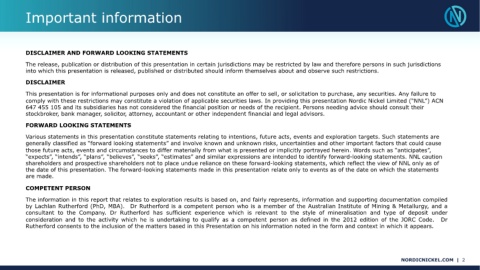 comply with these restrictions may constitute a violation of applicable securities laws. In providing this presentation Nordic Nickel Limited (“NNL”) ACN