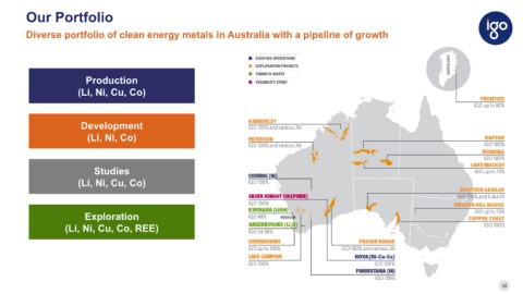 Our Portfolio Diverse portfolio of clean energy metals in Australia with a pipeline of growth Production (Li, Ni, Cu, Co) Development (Li, Ni, Co) Studies (Li, Ni, Cu, Co) Exploration (Li, Ni, Cu, Co, REE) 12
