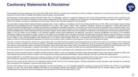 This presentation has been prepared by IGO Limited (IGO) (ABN 46 092 786 304). It should not be considered as an offer or invitation to subscribe for or purchase any securities in IGO or as an