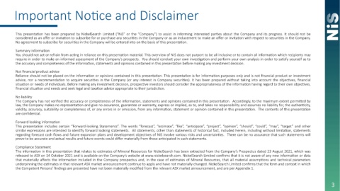 This presentaHon has been prepared by NickelSearch Limited (“NiS” or the “Company”) to assist in informing interested parHes about the Company and its progress. It should not be