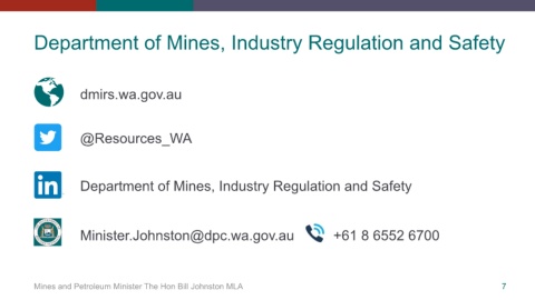Department of Mines, Industry Regulation and Safety dmirs.wa.gov.au @Resources_WA Department of Mines, Industry Regulation and Safety Minister.Johnston@dpc.wa.gov.au +61 8 6552 6700 Mines and Petroleum Minister The Hon Bill Johnston MLA 7
