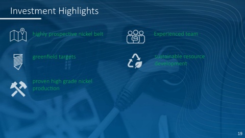 Investment Highlights highly prospecHve nickel belt Experienced team greenfield targets sustainable resource development proven high grade nickel producHon 19