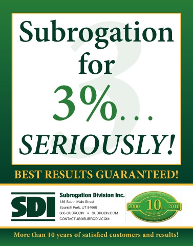 Subrogation for 3%. . . SERIOUSLY! BEST RESULTS GUARANTEED! Subrogation Division Inc. 136 South Main Street Spanish Fork, UT 84660 866-SUBRODIV • SUBRODIV.COM CONTACTUS@SUBRODIV.COM More than 10 years of satis ed customers and results!