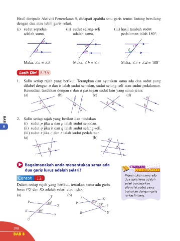 dilabel dengan a dan b ialah sudut sepadan, sudut selang-seli atau sudut pedalaman.