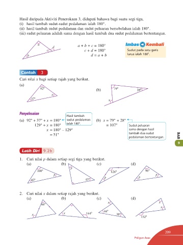 (a) 92° + 37° + x = 180° sudut pedalaman (b) x = 79° + 28°