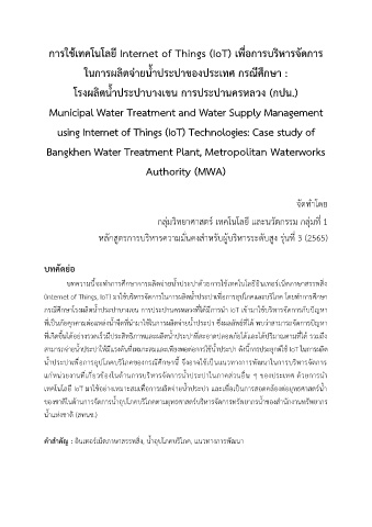 (Internet of Things, IoT) มาใช้บริหารจัดการในการผลิตน้ำประปาเพื่อการอุปโภคและบริโภค โดยทำการศึกษา