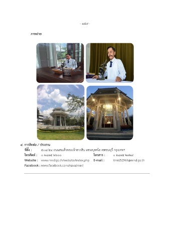 - ๑๕๗ - ภาพถ่าย ๔. การติดต่อ / ประสาน ที่ตั้ง : ๕๐๔/๕๔ ถนนสมเด็จพระเจ้าตากสิน แขวงบุคคโล เขตธนบุรี กรุงเทพฯ โทรศัพท์ : ๐ ๒๔๗๕ ๒๖๐๐ โทรสาร : ๐ ๒๔๗๕ ๒๗๒๙ Website : www.nmd.go.th/website/index.php E-mail : itmid52964@nmd.go.th Facebook : www.facebook.com/navalmed