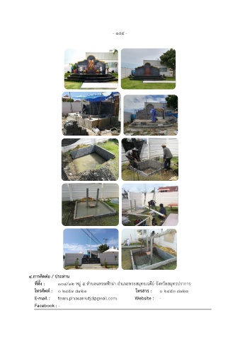 - ๑๘๕ - ๔.การติดต่อ / ประสาน ที่ตั้ง : ๑๐๔/๑๒ หมู่ ๕ ต าบลแหลมฟ้าผ่า อ าเภอพระสมุทรเจดีย์ จังหวัดสมุทรปราการ โทรศัพท์ : ๐ ๒๔๕๓ ๘๓๒๑ โทรสาร : ๐ ๒๔๕๓ ๘๓๒๑ E-mail : team.phrasamutjd@gmail.com Website : - Facebook : -