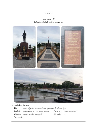 - ๒๐๑ - ภาพพระอนุสาวรีย์ ในปัจจุบัน เมื่อวันที่ ๑๒ สิงหาคม ๒๕๖๓ ๔. การติดต่อ / ประสาน ที่ตั้ง : ๑๐๖ หมู่ ๓ ต าบลศาลายา อ าเภอพุทธมณฑล จังหวัดนครปฐม โทรศัพท์ : ๐ ๒๔๗๓ ๓๔๑๐ , ๐ ๒๔๗๕ ๓๖๑๗ โทรสาร : ๐ ๒๔๗๓ ๓๖๑๓ Website: www.navedu.navy.mi.th E-mail : - Facebook : -
