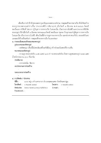 - องค์พระรูป เป็นเนื้อโลหะสัมฤทธิ์รมด าสีมันปู สร้างจ าลองในพระอิริยาบถยืน