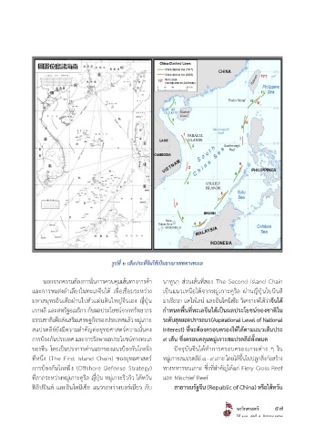 การป้องกันไกลฝั่ง (Offshore Defense Strategy) ทางทหารบนเกาะ ซึ่งที่ส�าคัญได้แก่ Fiery Cross Reef