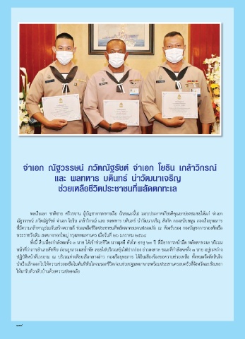 ทั้งนี้ สืบเนื่องก�าลังพลทั้ง ๓ นาย ได้เข้าช่วยชีวิต นางผุสดี คันโท อายุ ๖๓ ปี ที่มีอาการหน้ามืด พลัดตกทะเล บริเวณ