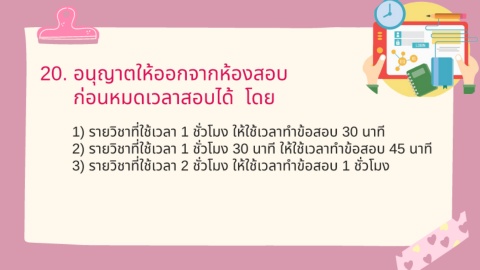 ุ 20. อนญาตให้ออกจากห้องสอบ ่ กอนหมดเวลาสอบได้ โดย ํ ี 1) รายวิชาทใช้เวลา 1 ชั วโมง ให้ใช้เวลาทาข้อสอบ 30 นาท ี ี ี ํ 2) รายวิชาทใช้เวลา 1 ชั วโมง 30 นาท ให้ใช้เวลาทาข้อสอบ 45 นาท ี ํ 3) รายวิชาทใช้เวลา 2 ชั วโมง ให้ใช้เวลาทาข้อสอบ 1 ชั วโมง ี