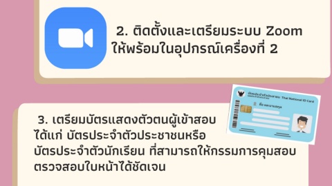 ั ี 2. ตดต งและเตรยมระบบ Zoom ิ ุ ใหพรอมในอปกรณเคร องท 2 ้ ้ ์ ื ี ั 3. เตรยมบตรแสดงตวตนผเขาสอบ ั ี ้ ู้ ื ่ ั ไดแก บตรประจําตวประชาชนหรอ ้ ั ้ บตรประจําตวนกเรยน ท สามารถใหกรรมการคมสอบ ั ี ี ุ ั ั ้ ้ ั ตรวจสอบใบหนาไดชดเจน