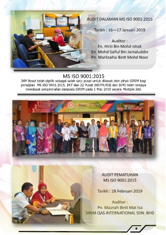 pensijilan MS ISO 9001:2015. BKT dan 22 Pusat (KKTM,MJII dan IKM) telah berjaya