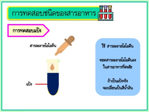 การทดสอบชนิดของสารอาหาร การทดสอบแป้ง สารละลายไอโอดีน ใช้ สารละลายไอโอดีน หยดสารละลายไอโอดีนลง ในสารอาหารที่สงสัย ถ้าเป็นแป้งจริง แป้ง จะเปลี่ยนเป็นสีน้ าเงิน