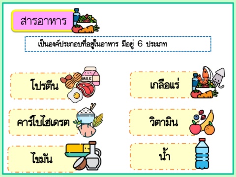 สารอาหาร เป็นองค์ประกอบที่อยู่ในอาหาร มีอยู่ 6 ประเภท โปรตีน เกลือแร่ คาร์โบไฮเดรต วิตามิน ไขมัน น้ า