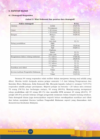 Kawalan Mutu Makanan, Kolej Komuniti Sik. Merujuk kepada Jadual 2, seramai 71(75.5%)