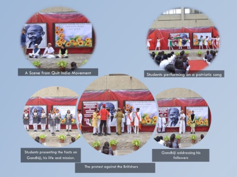 A Scene from Quit India Movement Students performing on a patriotic song Students presenting the facts on Gandhiji addressing his Gandhiji, his life and mission. followers The protest against the Britishers